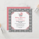 Chic square shaped baby shower invitation done in a grey and white damask pattern, with a white square text area with a pink decorative frame. Sweet graphics of a vintage looking coral pink baby buggy, decorates the top, of the text area. Personalise the coral pink and grey text for your baby shower. Matching products are available.
