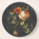 Vintage Still Life with Roses by Elias van den Broeck on Black. This old masterpiece oil on canvas painting shows red roses a butterfly and a snail.