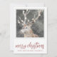 A serene and elk in winter snow with glowing tree lights in antlers, with a pine and leaf bough border. Modern rose pinks script merry Christmas.