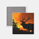 An elk stands on a hilltop as a wildfire rages behind him. His silhouette stands out sharply against the fire in the background. Computer art by Kathie Miller.