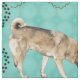 Elkhound exploring with nose down against a green background with paws and bones