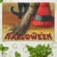A charming vintage Halloween kitchen towel featuring the equipment of a witch, painted by the American illustrator/commercial artist Ellen Hattie Clapsaddle.