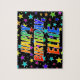 This vibrant, lively, birthday-themed jigsaw puzzle design has the message "HAPPY BIRTHDAY, ELLIE" with the characters having a colorful rainbow spectrum inspired gradient pattern, in addition to a fun field of stars background pattern. An exciting puzzle like this might be used to send a birthday greeting message to somebody named Ellie. [~Z0000468]