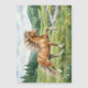The scene includes mountains, fir trees, and a serene stream in the background.