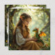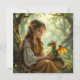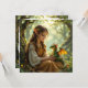 A sweet whimsical card featuring an elven fairy in vintage dress sitting with her dragon.