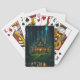 A deck of cards with the painting of a peaceful Tolkienesque Elven castle in a serene forest by a pond at dusk. Fairy lights illuminate the surroundings. Image was made with Leonardo.ai.