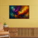 A solitary tree stands silhouetted against a sky ablaze with motion and emotion. On the left, deep blues and purples swirl behind bare branches—quiet, introspective, almost frozen in time. To the right, the sky ignites in fiery oranges, reds, and golds, as a flock of birds erupts from the colour storm, led by a single, soaring figure. The composition captures a moment of transformation: from stillness to flight, dusk to dawn, shadow to radiance. Each brushstroke pulses with energy, inviting the viewer to witness the tension between rootedness and release.