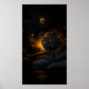 This stunning wall art portrays a majestic leopard resting gracefully on riverbank stones, its form illuminated by a warm, fiery glow that contrasts beautifully with the deep night around it. Golden embers and fluttering butterflies drift through the air, giving the scene a magical, almost mythical atmosphere. The leopard’s piercing amber eyes reflect the moonlight overhead, capturing both strength and serenity in a single gaze. With its rich contrast of shadow and light, this artwork evokes the quiet power of nature and the mysterious beauty of the wild after dark.