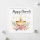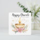 A radiant golden diya flickers at the heart of a floral wreath—petals of pink and purple unfurling around its flame like blessings in bloom. Intricate patterns and scattered golden specks evoke a sense of sacred celebration, where light becomes both ritual and revelation. The accompanying quote, printed on the reverse, offers a poetic reflection to carry the spirit of the festival forward.