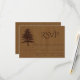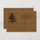 Embossed tree on wood rustic wedding RSVP card with meal choice. It showcases a conifer tree in embossed relief style on brown wood grain and the "RSVP" in a decorative font.