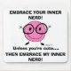 A design for all the nerds out there (like me!)! "EMBRACE YOUR INNER NERD! Unless you're cute.... THEN EMBRACE MY INNER NERD!" Spread the nerd love with this cute, funny and downright awesome design! 'Inner Nerd' character hand drawn and digitally coloured. Copyright 2013 by Sunny