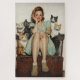 A delightful and humourous take on the “crazy cat lady” trope, this vintage-style portrait features a cheerful young woman sitting on a vintage trunk, surrounded by an adorable assortment of cats. Dressed in a retro floral dress and sturdy boots, her playful smile and the quirky cat companions bring charm and humour to the scene, celebrating the joy of feline obsession.
