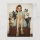 A delightful and humourous take on the “crazy cat lady” trope, this vintage-style portrait features a cheerful young woman sitting on a vintage trunk, surrounded by an adorable assortment of cats. Dressed in a retro floral dress and sturdy boots, her playful smile and the quirky cat companions bring charm and humour to the scene, celebrating the joy of feline obsession.