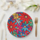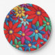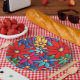 Embroidery abstract daisy flower pattern in red, yellow, blue, and green colours.