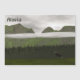 A "primitive" or folk style painting of green conifer and mountains on a very grey day with low hanging clouds. A bull moose (Alces alces) in the foreground lends scale to the scene. Customisable text reading, "Alaska" also appears.