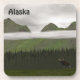 A "primitive" or folk style digital painting of green conifer trees and mountains in Alaska on a very grey and cloudy day. A bull moose (Alces alces) in the foreground lends scale to the scene. Customisable text reading, "Alaska" also appears.