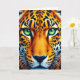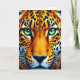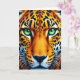This design shows a large spotted feline shown straight on, filling the frame in near-symmetrical balance, with a steady gaze that feels like a quiet, intimate moment between you and the animal. Its eyes shine in bright emerald green, catching tiny highlights that make them look alive and almost conversational. The fur is layered in warm oranges and golden yellows, contrasted by scattered black rosettes that curve with the face and suggest a soft, dense coat. Along the muzzle, lighter cream fur and fine shading shape the cheeks and brow, while a deep blue-toned nose sits at the centre like a calm anchor. Thin white whiskers fan outward in crisp arcs, adding a gentle, affectionate softness to the otherwise powerful expression. A short line of text sits near the top in small white letters, with a second line placed near the bottom in matching white, leaving the face unobstructed. The background stays dark and muted so the colours feel richer, like a late-night scene on the road 🚗, and the emerald eyes remain the brightest point 👨. The rosettes are velvety black, spaced across the forehead and cheeks, and the nose reads as indigo against the warm fur.