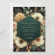This elegant design features a dramatic display of creamy ivory anemones and pale golden peonies. The lush florals are arranged against a deep, moody background of emerald and black. Gilded botanical accents add a touch of warmth and luxury, creating a sophisticated atmosphere for a romantic union.