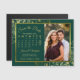 These beautiful emerald green and gold magnetic cards are the perfect way to let your family and friends know to save the date for your upcoming wedding. The elegant design features your photo inside of a golden faux foil frame with delicate curls and swirls in the corners. There is fancy script lettering and a customisable calendar showing your wedding month with a heart around your special day. Convenient and practical, this card is sure to please.