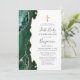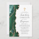 The left-hand edge of this elegant modern first communion invitation features an emerald green watercolor agate border trimmed with faux gold glitter. A faux gold foil cross appears above the customisable text, which combines handwriting, copperplate and italic fonts in charcoal grey on a white background. The reverse side features a matching emerald green and gold agate design.