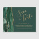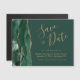 This elegant save the date magnetic card features an emerald green watercolor agate border trimmed with faux gold glitter. The customisable text combines gold-coloured handwriting script, copperplate and italic fonts on a green background.
