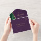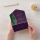 The left-hand edge of this elegant modern all-in-one wedding invitation and RSVP features an emerald green watercolor agate border trimmed with faux gold glitter. The detachable RSVP card includes space for guests to initial their choice of three entrees. The customizable text combines gold-colored handwriting, copperplate and italic fonts on a purple background. The return address appears on the outside flap and on the reverse side of the RSVP.