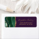 The left-hand edge of this elegant modern wedding invitation return address label features an emerald green watercolor agate border trimmed with faux gold glitter. The customisable text combines gold-coloured handwriting script and copperplate fonts on a purple background.