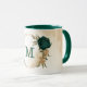 Beautiful coffee mug featuring emerald green and beige gold flowers with green leaves .