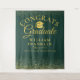 An elegant graduation photo booth backdrop featuring your grad's details set in chic typography on an emerald green and gold glitter background. Designed by Thisisnotme©
