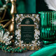 This exquisite wedding invitation combines the grandeur of Islamic art with the timeless elegance of a floral motif. The front of the invitation is adorned with a lush emerald green background, overlaid with an intricate antique gold floral pattern that exudes a sense of luxury and sophistication. Centred in the artwork is a beautifully crafted Arabic calligraphy in gold, symbolising the spiritual element of the union. The reverse side features a cohesive design with a monogram intertwined with a golden tree, symbolising growth and unity, set against the same rich emerald backdrop. The use of emerald and gold adds a regal touch and represents prosperity and wisdom in this celebration of love. This invitation is perfect for couples who appreciate the fusion of traditional artistry with a modern aesthetic for their special day.