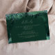 This design features a dark green arch on a background of emerald green watercolor agate trimmed with green and silver faux glitter. The word "details" appears in elegant white calligraphy script, with customisable white text below. The green and silver design is repeated on the back of the card.