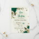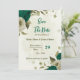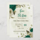 Beautiful romantic wedding save the date invitation featuring emerald green and beige flowers and some leaves .