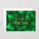 Gift Certificate card featuring the words "A Gift For You" in faux gold foil against an emerald green bokeh lights pattern background on the front.