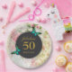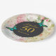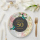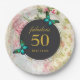 A birthday paper plate - fabulous 50 with a personalised name. Designed with elegant green butterflies. A black circular frame in the centre layered over top a vintage collage pattern with dainty pink roses and green gold leaves with a shabby old fashioned look.