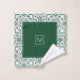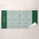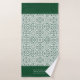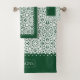 Emerald green and white damask pattern and scalloped borders Bath Towel Set. The bath towel features an elegant green and white damask pattern and bands on the short sides with scalloped edges. There is also a frame with your family name. The hand towel showcases a scalloped border around it while the wash cloth is in green colour in the centre with a damask border and your monogram. You can personalise it with your family name and monogram.