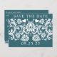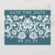 Save the Date White Vintage Damask Shown A Emerald Green that is sure to please the bride- But You Choose Card and Font Colours- Have Fun Picky Your Wedding Colours and creating a one of a kind Save the Date Postcard
