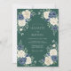 This design features a rich forest green backdrop that sets a moody and formal tone. Creamy ivory roses and deep navy blue blossoms create a striking contrast in the corners of the composition. Delicate green foliage and leafy sprigs add a natural, botanical touch to the wintertime aesthetic. The palette of emerald, navy, and white evokes a sense of timeless elegance.