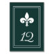 Elegant and simple Wedding Table Card featuring a fleur de lis against an emerald green background. This design is a unique choice for a modern wedding. Easy to customise with the appropriate table number(s). Click "Customise It" to find more personalisation options.