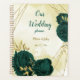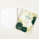 Beautiful wedding planner featuring emerald green flowers and gold leaves.