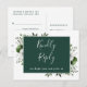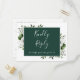 An elegant watercolor emerald green floral RSVP card with chic typography. The reverse features your details and a fun guest song request. Designed by Thisisnotme©