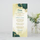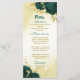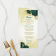 Beautiful wedding menu card featuring emerald green flowers and gold leaves.
