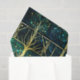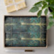 Elegant celestial emerald green forest faux stained glass pattern with gold accents with blue and green background