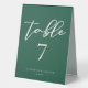 This solid emerald green wedding table number table tent sign features classic white script for a couple getting married in a forest or other nature venue. Celebrate your love with this tranquil colour and coordinate with our matching minimalist typography collection.