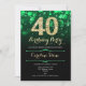 40th birthday party invitation. Elegant emerald green and black design with faux glitter gold. Features stylish diamonds, bokeh lights and script font. Men or women bday invite. Perfect for a stylish adult birthday party. Personalise with your own details. Message me if you need further customisation. Printed Zazzle invitations or instant download digital printable template.