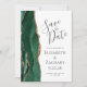 The left-hand edge of this elegant modern wedding save the date card features an emerald green watercolor agate border trimmed with faux gold glitter. The customisable text combines charcoal grey handwriting, copperplate and italic fonts on a white background. The reverse side provides spaces for 5 photos (3 horizontal 1 square and 1 vertical) and room for your wedding website URL or other brief message.