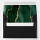 The inside of this elegant modern wedding invitation envelope features an emerald green watercolor agate design trimmed with faux gold glitter. Customise the back flap with the names of the bride and groom in gold coloured handwriting script and return address in copperplate font on an off-black background.