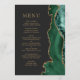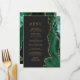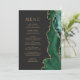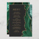The right-hand edge of this elegant modern wedding menu features an emerald green watercolor agate border trimmed with faux gold glitter. The customisable text combines gold-coloured serif and copperplate fonts on an off-black background. The reverse side features a matching green and gold agate design.