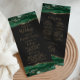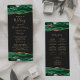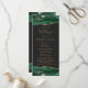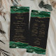 This elegant, modern wedding program features emerald green watercolor agate top and bottom borders trimmed with gold faux glitter. The text appears in elegant gold-coloured handwriting and copperplate fonts on a dark background.