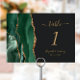 The left-hand edge of this elegant modern wedding table number card features an emerald green watercolor agate border trimmed with faux gold glitter. The customisable text combines gold-coloured handwriting, italic and copperplate fonts on an off-black background.