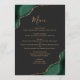 This elegant modern wedding menu features emerald green watercolor agate corners trimmed with faux gold glitter. The customisable text combines gold-coloured whimsical handwriting script and copperplate fonts on a slate black background. The reverse side features a matching emerald green and gold agate design.